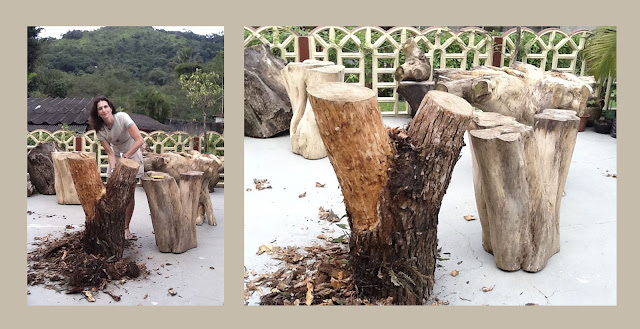 A procura da matéria prima é constante e quase sempre as árvores são fotografadas antes da transformação. Os pedaços de troncos ou raízes jogados na mata, rios ou ruas se transformam em bases de mesas e  em luminárias.